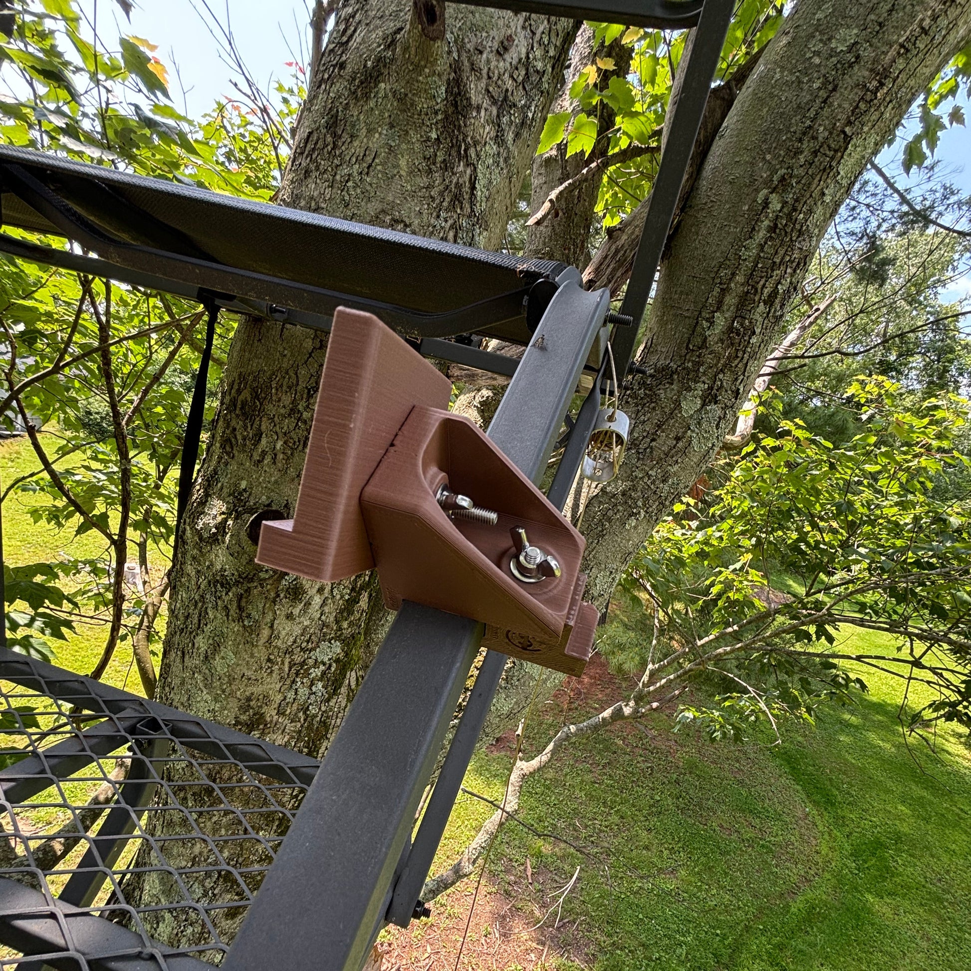 Mounts directly to the rail of your Tree Stand. Features an adjustable T-Nut for 1" or 3/4" tubing and a bracket that can rotate 360 degrees and lock into place.